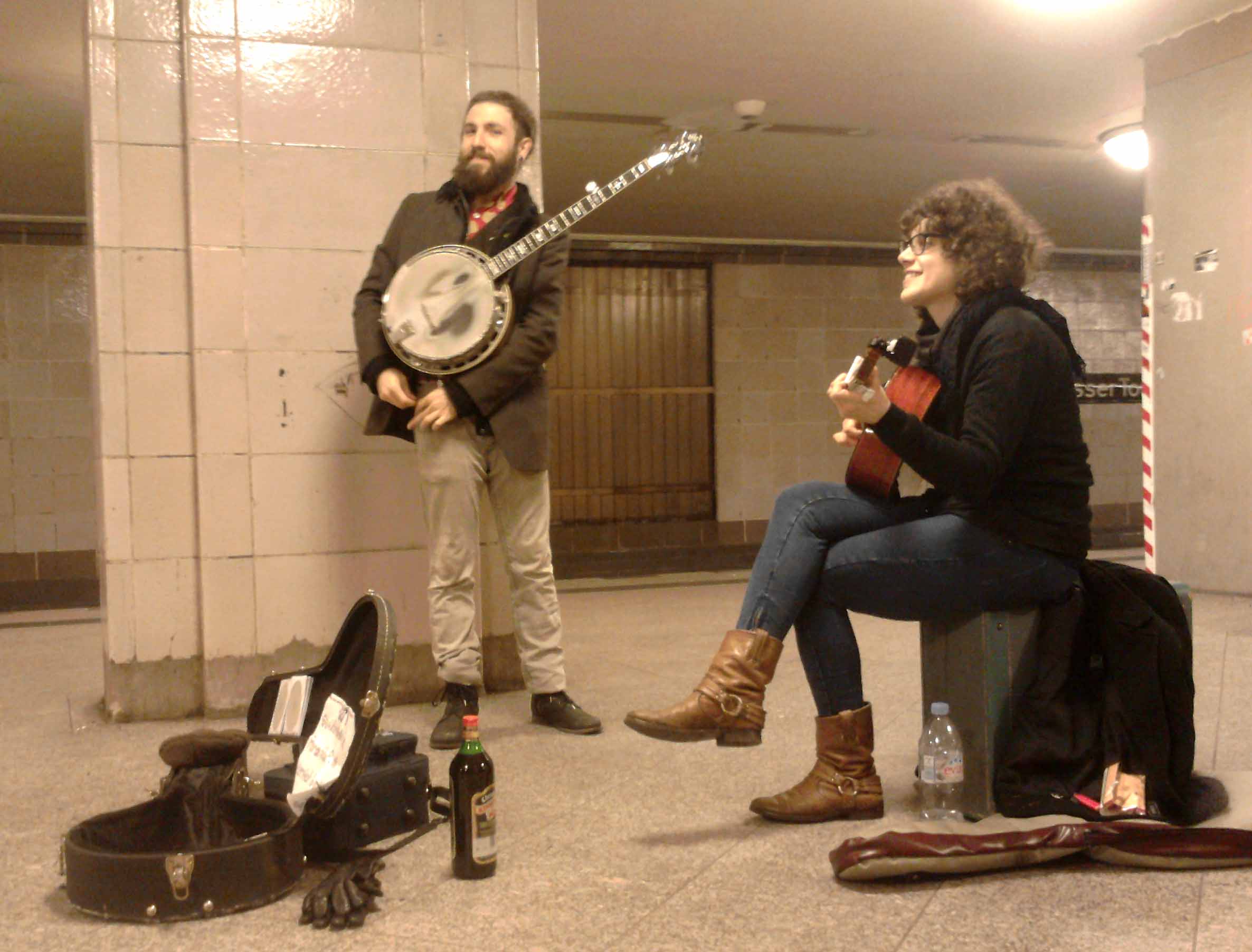 0.30 Uhr: Auf dem Bahnsteig Kottbusser Tor rockt die „Piano moving company“, nur ein Banjo und eine Gitarre. Aber der Mann mit dem Vollbart und die Frau mit dem schönen Lachen übertragen ihre Begeisterung direkt ins Publikum. Die Mischung aus Unplugged-Rock und Country hält für ein paar Minuten die Familie fest, die auf dem Weg nach Hause ist. Auch das gutgekleidete Pärchen, das aus dem Theater kommt. Den Obdachlosen, der den beiden eine volle Flasche Glühwein hinstellt. Und die Mädchen im Party-Modus. Mit seinem breiten amerikanischen Englisch erklärt der Banjo-Spieler, dass die Band aus sechs Leuten besteht, sich aber nur sie zwei nach Berlin aufgemacht haben, um hier mit Straßenmusik anzufangen. Das klappt ziemlich gut. Oft bietet ihnen jemand aus dem Publikum einen Auftritt an. Der Banjo-Spieler lacht. „Jetzt spielen wir auf dem Bahnhof und im nächsten Moment in einem Club.“
