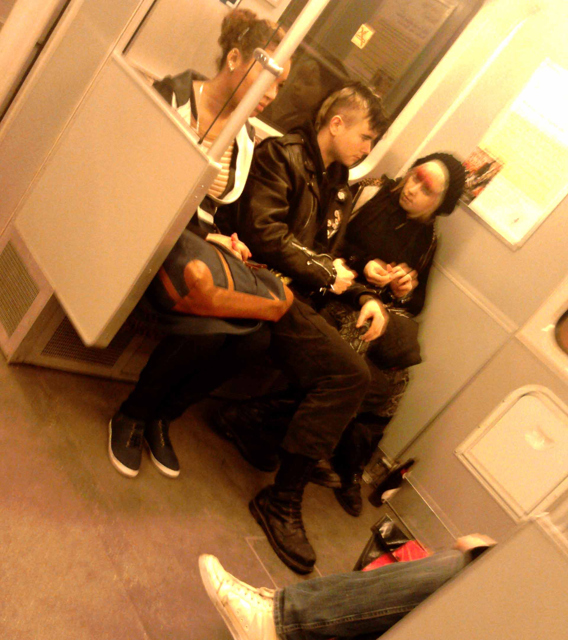 Über zwei Vierer-Sitze verteilt, fläzt sich eine Bande HipHoper. Sie rappen: „Wenn die Bullen kommen, pscht, vor dem Richter, pscht, keine Aussage, pscht, droh den Zeugen, pscht.“ Sie kommen ins Stocken. Zweiter Versuch – „… droh den Zeugen, pscht.“ Schon wieder klemmt’s. Ein in sein Buch vertiefter Student sieht genervt nach oben und sagt: „Halt die Fresse, sus.“ Die HipHop-Jungs werden aggressiv: „Was, willst’e stressen?“ Der Student: „Oh Mann, so heißt der Text.“ Die Jungs gucken erst irritiert, dann kann man sehen, wie es im Kopf klick macht und sie fangen an zu grinsen. „Alles klar, Mann. Halt die Fresse, sus.“