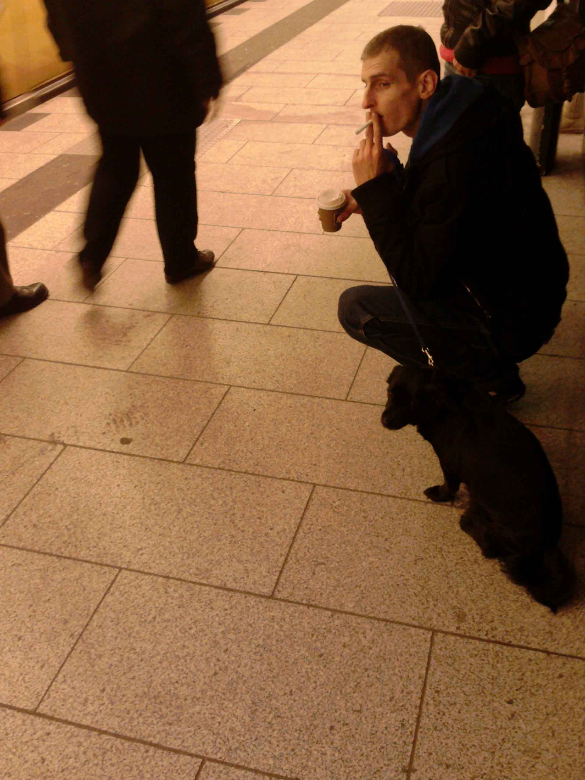 „Die“ sehen aus wie 18, haben aber die Meute, die sich um sie herum versammelt hat, gut im Griff. Da ist ein Rastamann mit seinen zwei Hunden und einer Bierflasche in der Hand. Da ist ein junges, blondes polnisches Mädchen, das sich lautstark mit seinen beiden männlichen Begleitern streitet. Da ist ein Szene-Typ mit Hornbrille und Oberlippenbart, der so tut, als ob er nicht dazugehören würde. Außerdem drei stark mitgenommene Gestalten. Dann nehmen die Dealer die Bestellungen auf. Dabei gehen sie reihum und sprechen mit jedem Einzelnen. Dann bleibt einer bei den Kunden, der andere verschwindet mit einem Handy am Ohr nach oben. Ware abholen.