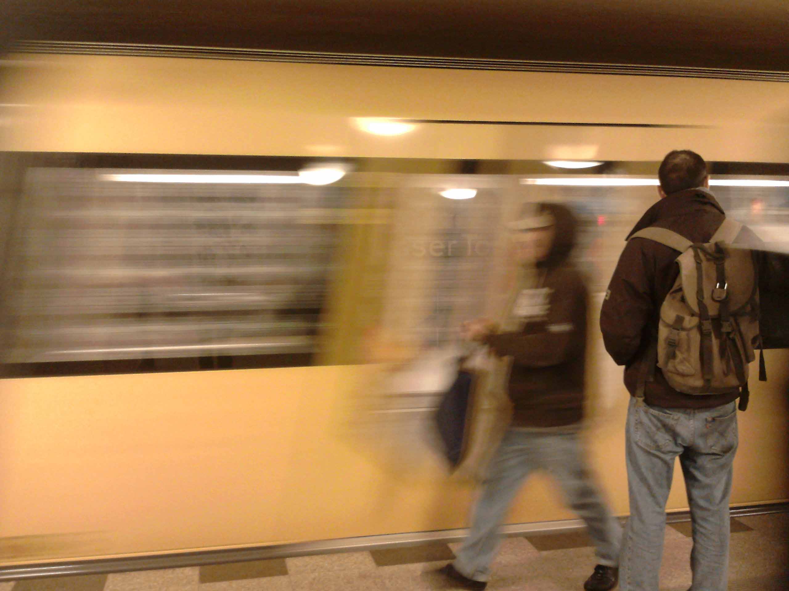 Nächster Halt: Hermannplatz. Am Bahnsteig stehen die Massen jetzt dicht an dicht. Ein Strom von Menschen, die nach oben zur U8 oder nach unten zur U7 wollen, auf den linken oder auf den rechten Bahnsteig. Es wird gedrängt, geschoben, geschubst, böse geguckt und geflucht. Ein stämmiger Vater mit langen Haaren und dichtem Bart trägt einen Kinderwagen wie ein Schild vor sich die Treppe hoch, hinter ihm die zwei Hunde, an der Hand der Mutter die zwei Kinder. Das Signal zum Türenschließen ertönt. Inzwischen ist der Vater oben angekommen. Die Hunde fangen an zu bellen. Das Schauspiel aktiviert die gelangweilten Fahrgäste. Auf einmal schauen alle gebannt auf die Tür. Schaffen sie es? Gerade noch rechtzeitig schiebt der Vater den Kinderwagen zwischen die Türen. Die Notsicherung funktioniert, die Türen gehen wieder auf.