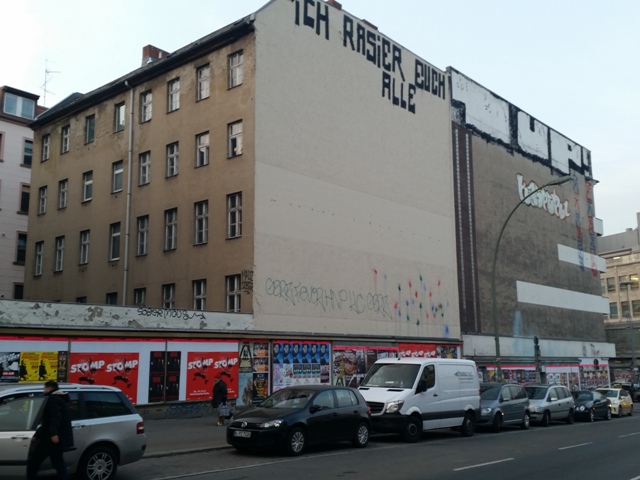 Blick nach oben, zu den Fenstern. Im ersten Stock hängen noch Gardinen, in den anderen Fenstern herrscht nur schmutzige Leere. Ganz oben unter dem Dach leuchtet ein fettes Graffiti „1UPÜF“. „1UP“ steht für „One United Power“. Eine Sprayer-Gruppe, die seit Jahren in Berlin ihre Spuren hinterlässt. Auch an der Seitenwand des Hauses steht ein riesengroßes „1UP“. Von dieser Sprühaktion kursiert im Internet sogar ein Video aus dem Jahr 2009. Darin ist zu sehen, wie drei, vier Sprayer die Aufschrift vom Dach des Hauses mit Farbrollern anbringen.