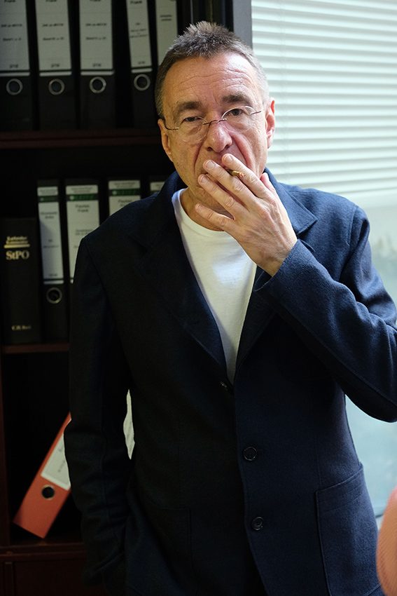 Seine Kanzlei liegt zwar auf dem edlen Kürfürstendamm, doch steht man dann vor dem Bürogebäude fällt auf, dass einem nichts auffällt. Seine Kanzlei, die er sich mit zwei anderen Anwälten teilt: normal und zweckmäßig. Sein Büro: normal und zweckmäßig. Bücherschrank, Schreibtisch, Computer, Couch. Er selber wirkt so normal, wie einer nur normal wirken kann. Nicht klein, nicht groß. Nicht dick, nicht dünn. Nicht laut, nicht leise. Zurückhaltend, ruhig. Die Beine übereinandergeschlagen, die Hände verschränkt, nur seine Daumen kreisen in einem fort um einander. Ab und zu tritt er ans Fenster, schaut auf die grauweiße Wand gegenüber, raucht Zigarillos. Stellt man ihm eine Frage, nimmt er sie erst einmal auseinander, bittet um genaueste Konkretisierung, bevor er sie beantwortet.