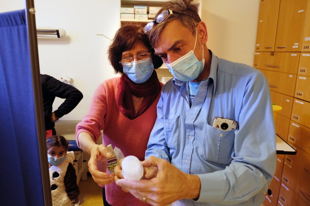 Im Behandlungszimmer geht es weiter. Obwohl die Corona-Pandemie allgegenwärtig zu sein scheint, die vielen anderen Erkrankungen hören deswegen ja nicht auf. Eine Frau um die 30 Jahre hat ein chronisch entzündetes Ohr. Es tut sehr weh. Sie geben ihr Antibiotika mit. Medikamente bekommt die Anlaufstelle gespendet und eine ehrenamtliche Apothekerin überprüft diese regelmäßig.