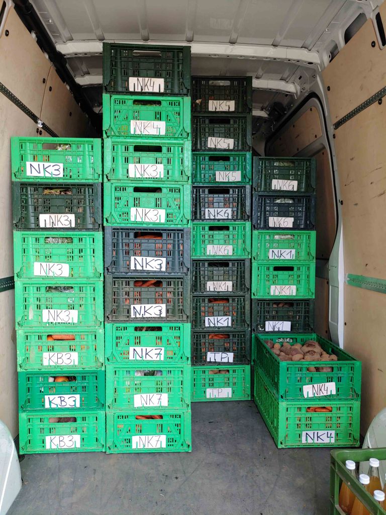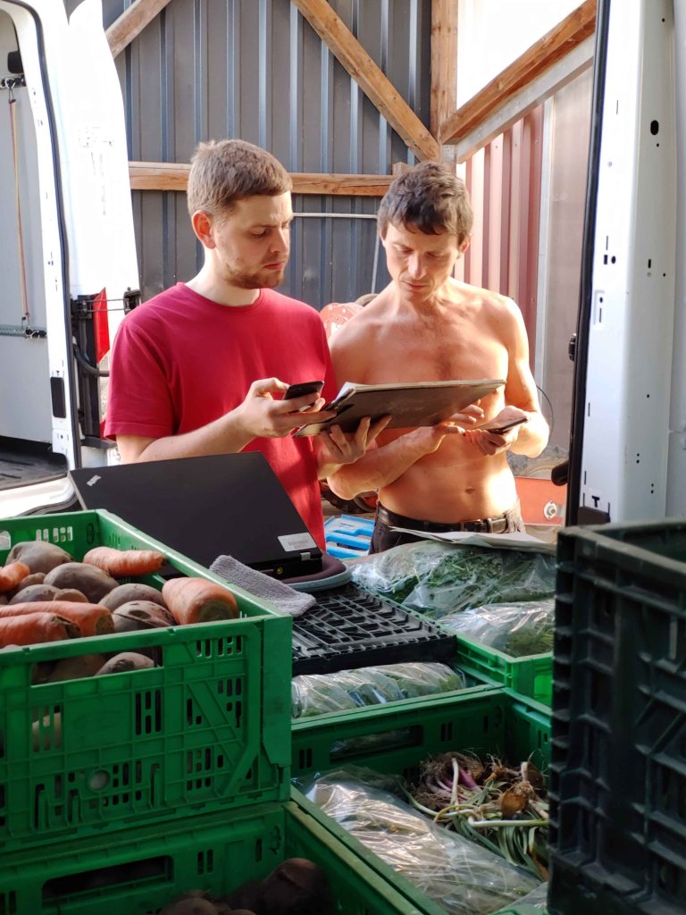 Hundert Meter weiter steht eine Lagerhalle mit zwei großen Kühlräumen. Darin stapeln sich grüne Kisten. Ognyan Tzotchev und zwei weitere Helfer sortieren und wiegen das Gemüse. „Wie viel entfällt auf jede Portion? Wie viel bekommt jede Gruppe? Das rechnen wir gerade aus“, erklärt er. Möhren, Kartoffeln, Sellerie und Rote Bete stammen noch aus der Winterernte, im Kühlhaus gelagert. „Knoblauch und Zwiebeln sind gestern Abend von unseren Helfern auf dem Hof ‚Grüner Berg‘ geerntet worden. Und der Apfelsaft kommt direkt von Simon Junge und seiner Apfelsternwarte.“