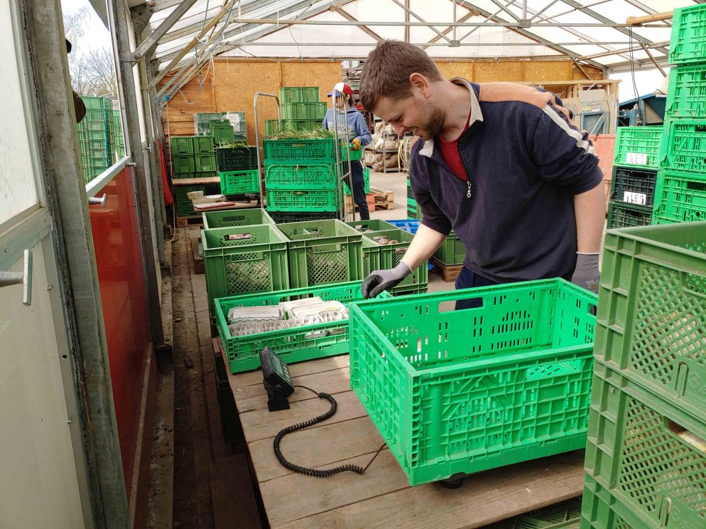 Ognyan und Sara fahren auf dem Florahof von Markus Schüler vor. „Ein Familienbetrieb. Vater und Mutter helfen auch mit“, erklärt Ognyan. Vater Schüler steht schon im Hof, „Markus schläft noch“, grüßt er. Dann öffnet er das Kühlhaus und schiebt die Salate raus. 550 Stück. Kiste für Kiste tragen Ognyan und Sara in den Lieferwagen. Jetzt kommt Markus Schüler doch dazu. Er will noch kurz über den Hof führen. Er zeigt die Pferde, die Gewächshäuser und das Feld, auf dem schon die nächsten Salate wachsen, von einer Plane vor dem kalten Ostwind geschützt.