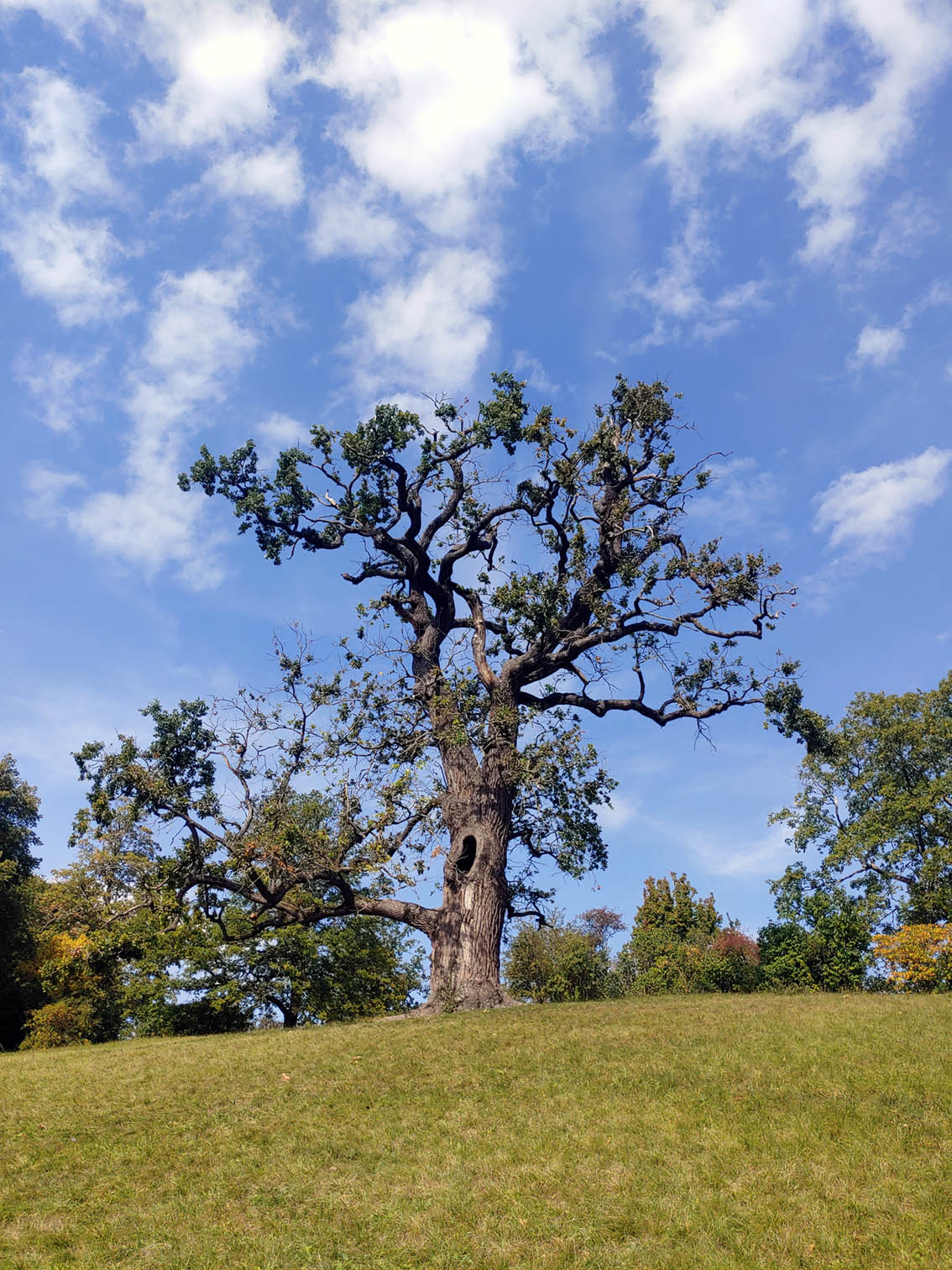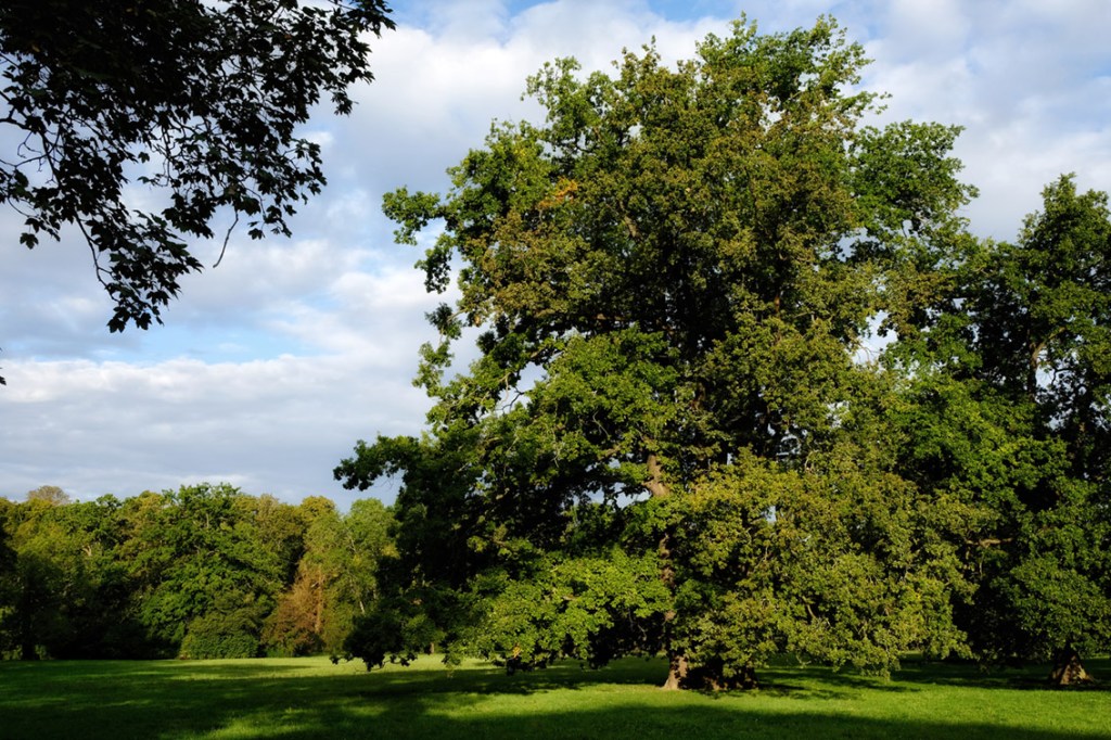 An diesem Spätsommertag führen er und Baumkontrolleur Jörg Edel durch die Parks und Gärten der Klassik Stiftung Weimar, um ebendiese Probleme sichtbar zu machen. Alle paar Meter bleiben sie stehen und zeigen auf Bäume und Sträucher. So wie im Park auf die Eichen da hinten: „Da kann man locker einen Medizinball durch die Krone werfen, das darf eigentlich nicht sein“, sagt Edel. Zwischen den Blättern klaffen große Löcher, durch die man den Himmel und die Wolken sehen kann. Die lichte Baumkrone, so der Fachbegriff, deutet auf einen kranken, schwachen Baum hin. Auch hinter Goethes Gartenhaus, das Herzog Carl August seinem Dichterfreund einst schenkte, steht eine dieser uralten Zeitzeuginnen. „Was die schon alles erlebt hat – Könige, Kriege und Dichter“, sagt Edel und legt seine Hand auf die knorrige Rinde. Gepflanzt wurde die Eiche 1755. Spendete ihren Schatten also schon, als Johann Wolfgang von Goethe, Friedrich Schiller oder Johann Gottfried Herder hier entlang-flanierten. „Diese Eiche hat eine Menge mitgemacht“, Edel zählt auf: „mehrere Astbrüche, mehrere Zurückschnitte, eine Fäule ist drin, ein Pilz ist dran“. Vor einiger Zeit ließen sie einen Gutachter kommen, der mit Mininadeln den Stamm anbohrte, um den Widerstand des Holzes und damit den Grad der Fäule zu messen. Regelmäßige Kontrollen sollen sicherstellen, dass von den Bäumen keine Gefahr, etwa durch umstürzende Stämme, ausgeht. Im Zweifel bliebe nur das Fällen des Baumes.