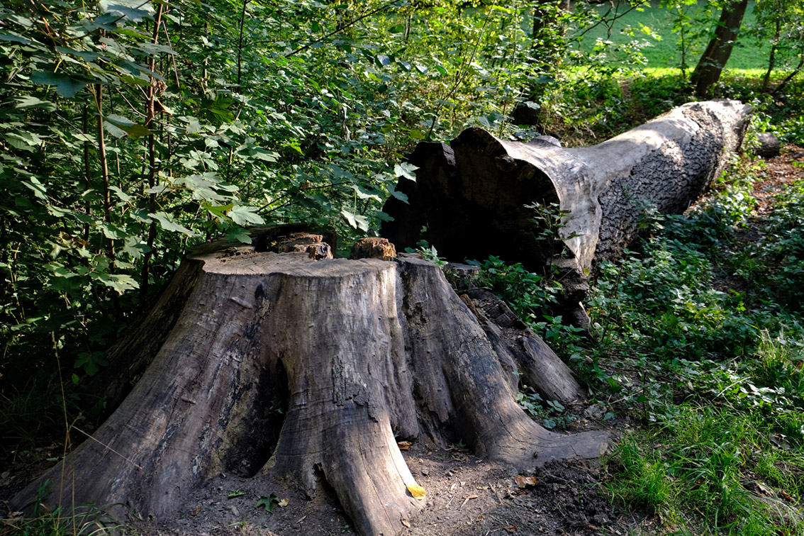 Wir können die Eiche noch ein bisschen stehen lassen“, sagt Edel erleichtert. Damit aber die schweren Äste nicht aus der Krone brechen, sind sie hinaufgeklettert und haben diese mit dicken Seilen gegen plötzliche Starkwinde gesichert. „Wir kämpfen um jeden Baum.“ Ein Stückchen weiter ragen Baum-stümpfe aus dem Boden. Drei mächtige Blutbuchen standen dort. „Sie stammten noch aus der Goethe-Zeit“, sagt Hupel, „im vergangenen Winter mussten wir die fällen“. Der Brandkrustenpilz hatte sich über die Bäume hergemacht. Der Pilz bildet eine schwarzweiße Kruste, breitet sich über den ganzen Baum aus und zerstört dabei das Holz. Mit dem Klimawandel an sich hat der Pilz wenig zu tun, erklärt Edel. Trifft er aber auf geschwächte Bäume, macht er kurzen Prozess.