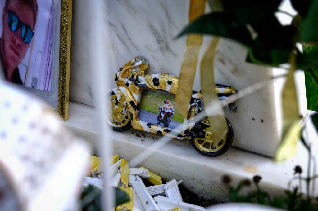 Das Grab ist ihr Tempel. Ihr Benni-Tempel. Jeden Tag kommt sie hierher, erklimmt die Treppen, die auf den Hügel des Luisenkirchhofes in Charlottenburg führen. Sie hat gleich zwei Grabstellen nebeneinander gebucht. Für die Trauerweide, die Jahr für Jahr größer wird. Für die Blumen. Für die Fotos. Für die kleinen Modell-Motorräder. Dort liegt auch das Visier, das beim Unfall von seinem Helm abgesprungen war. Bennis Vater hat es gefunden. Mit Edding hat er „Dein Papa“ draufgeschrieben. Neulich saßen drei von Bennis Freunden hier und spielten Uno. Dann waren welche zum Männertag da und haben einen Jägermeister auf ihn getrunken. „Dass die immer noch kommen. Das Leben geht doch weiter“, sagt sie.