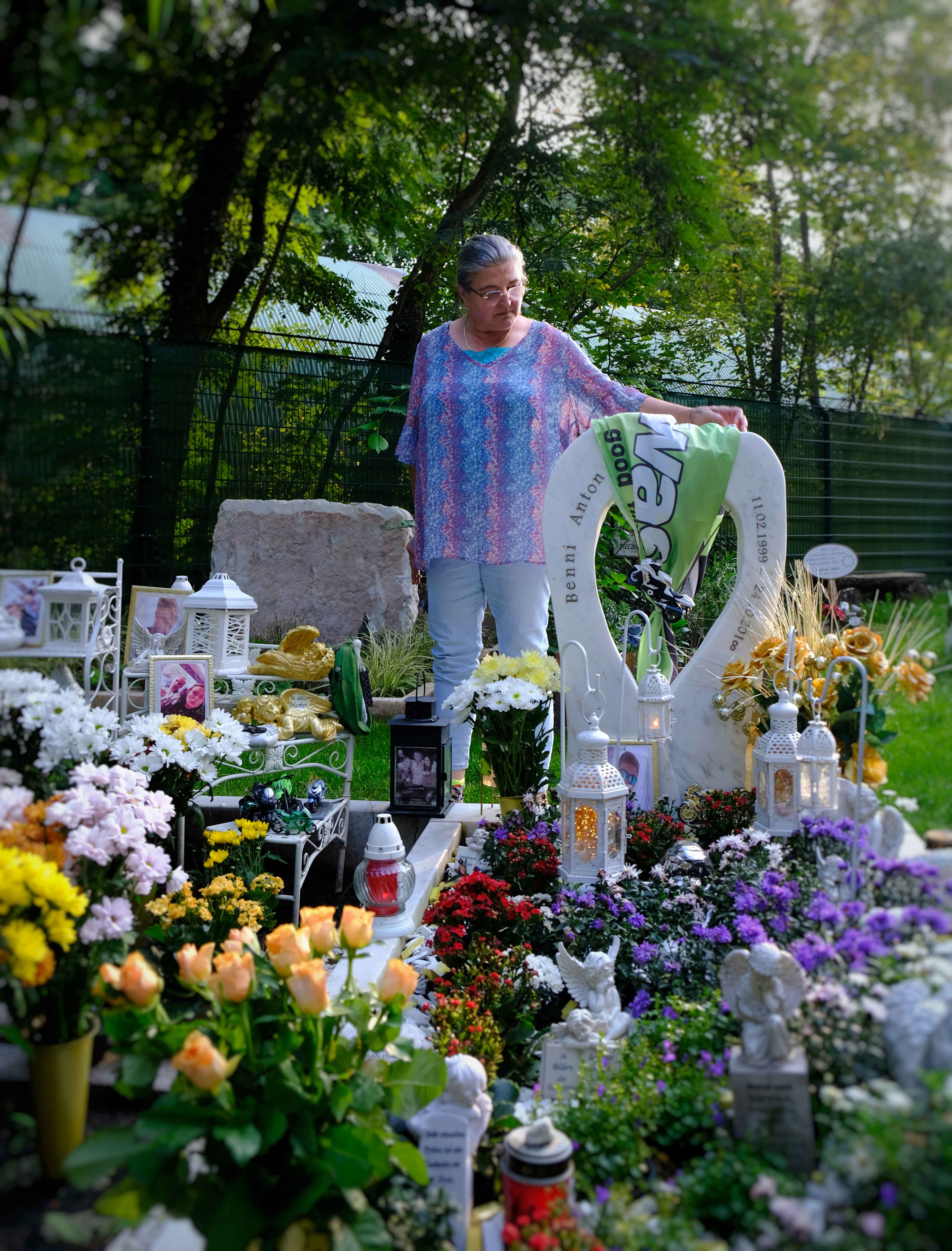 „Ich habe seine Kleidung rausgesucht, als er geboren wurde. Ich habe seine Kleidung rausgesucht, als er beerdigt wurde“, sagt sie. Eine Jogginghose hat Benni an, weil er es immer bequem mochte. Einen Motorradhandschuh hat er im Grab, den anderen hat sie behalten. Und eine Kette, die er immer nur für die Disco anzog. „Der alte Angeber“, sagt sie und lacht.