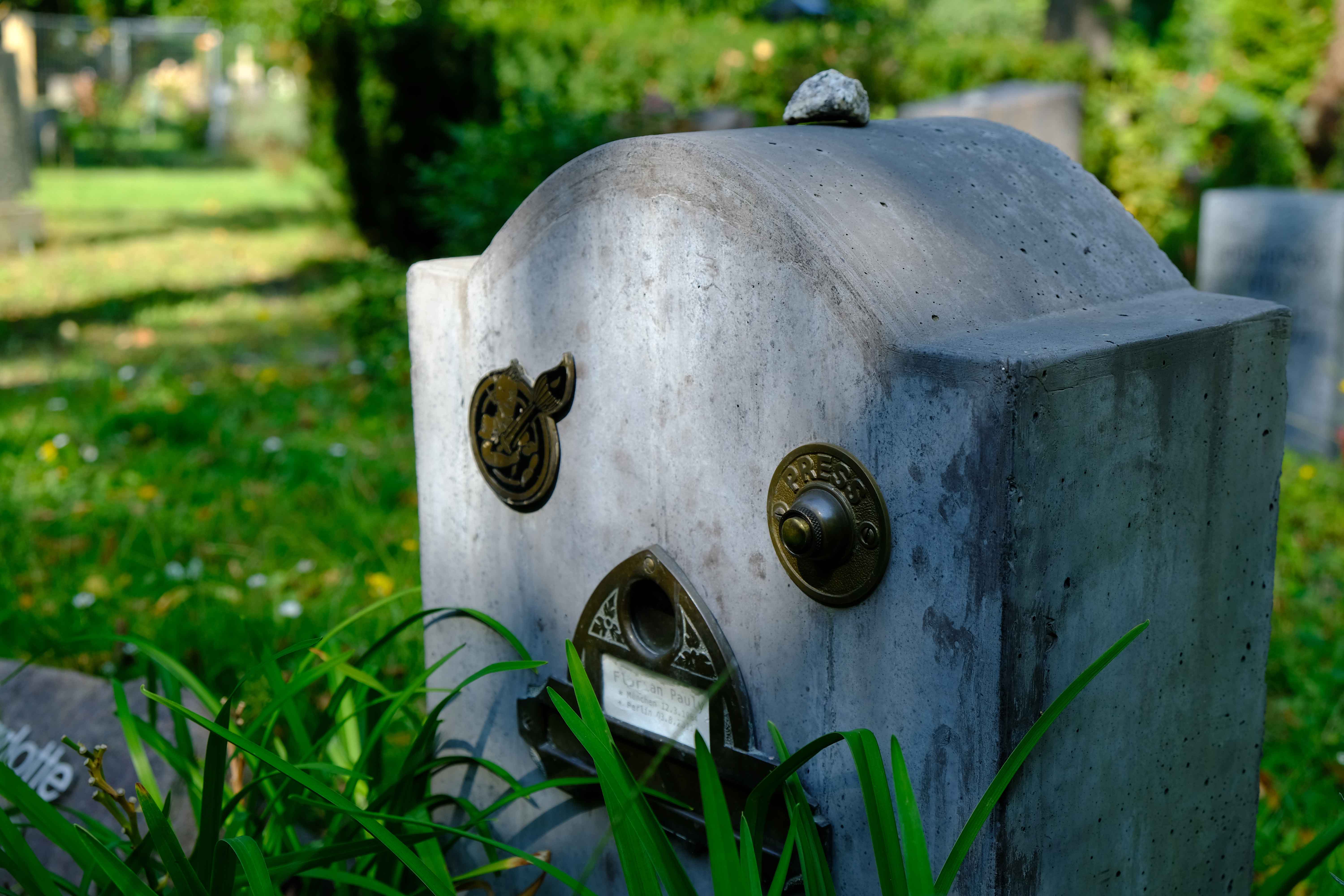 Florian Pauly – so steht es winzig auf dem Namensschild auf dem unscheinbaren Grabstein. Doch was ist das? Über dem Namensschild scheint ein Briefschlitz angebracht zu sein. Links davon prangt eine Art Emblem: ein kerniger junger Mann mit einem überdimensionierten Pinsel in der Hand. Und Flügeln. Rechts davon ist sogar ein Klingelknopf, auf dem „Press“ steht. Ist das eine Einladung? Darf man wirklich an einem Grab herumdrücken? Ja. Und tatsächlich: Ein leises Hundebellen erklingt aus dem Inneren des Steins.