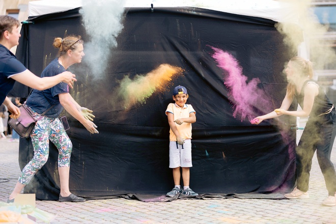 Pellio verbindet sein Handy per Bluetooth mit den Lautsprecherboxen. Hip-Hop dröhnt über den Marktplatz. „Auf geht’s“, ruft der Pfarrer, „zwei Stunden haben wir noch, dann muss alles stehen!“ Junge Leute stellen Bänke auf, bauen Pavillons zusammen, füllen Luftballons mit Helium, legen Stromkabel. Der Schweiß läuft, die Sonne knallt vom Himmel, Fußgänger schauen skeptisch. Sogar die Bürgermeisterin will nachher noch eine Rede halten. „In Berlin wäre das eine popelige Veranstaltung. Hier ist es umso wichtiger“, sagt Pellio.